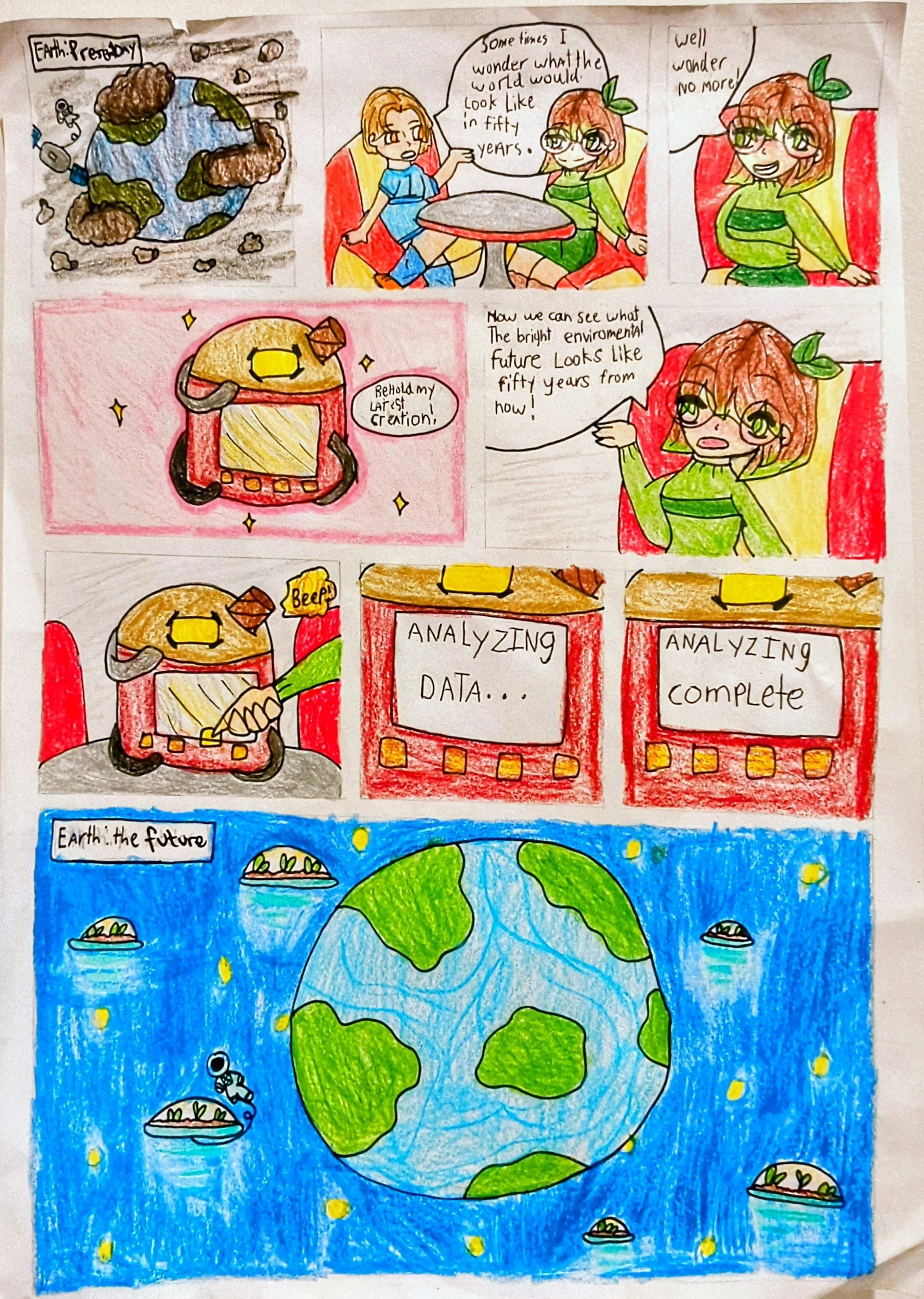 By the final panels, Zuri has sketched out her vision of a transformed world: clean rivers flowing, trees towering with lush green foliage, futuristic electric cars gliding past, holographic signs floating in the air, birds flying freely, and—perhaps most strikingly—no rubbish anywhere. The children stand beneath a vast tree, looking out with hope as one of them declares: “Someday we might get this amazing future!”